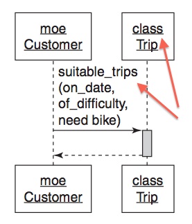 The only other place a class method has been used before this point is in Chapter 3, with regard to a module. So what's going on here? (Of course I know why: It's a finder method on something like an active record class.) The class method is preserved here even in the solution on p. 75. Might I not have a class hierarchy for Trip? Why is this a class method? What is a class method? To be sure, the Trip class is really just in a support role, but I think that absence of code means that the novice reader is going to have a hard time seeing the reality of what is being worked up. I'd also like to see how TripFinder is constructed: The text tells us that it will "embody the rules at the intersection of Customer, Trip, and Bicycle" - do they all get injected at object instantiation? All of this would be resolved with some code examples. They wouldn't even have to be quoted; they could just exist in the download. (As an aside, I also find it confusing that the the class name Customer is below the instance name ("moe"), while this order is effective reversed for Trip.)